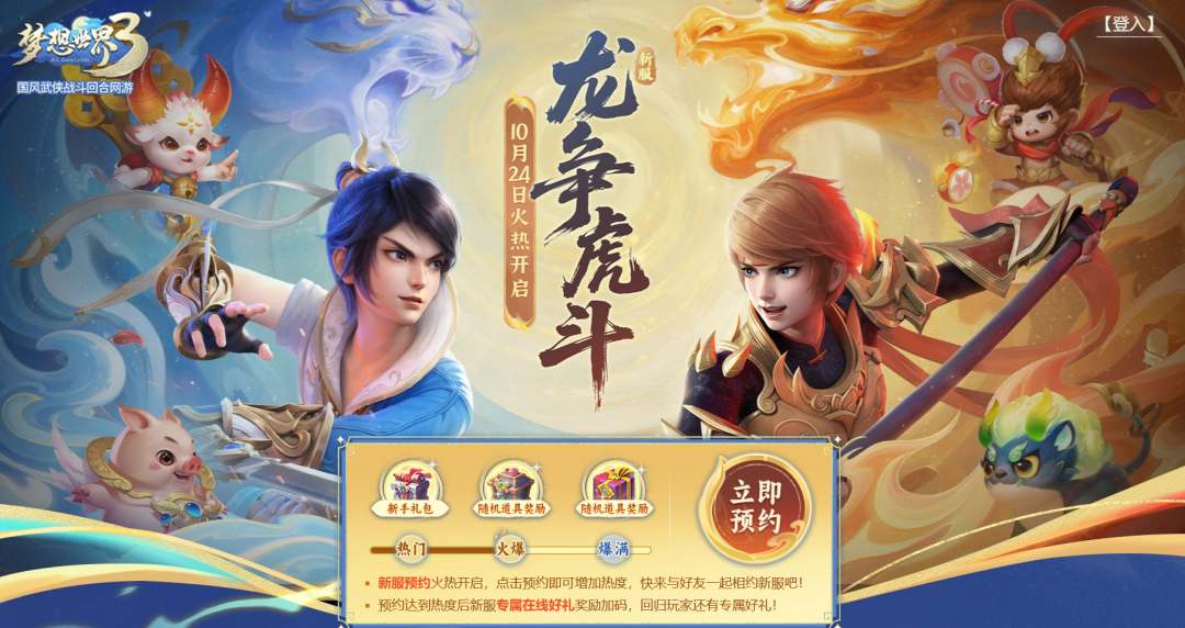 参与新服专属在线好礼活动,有机会获得兽魂勋章、神兽祝福石、终级兽诀等道具,还有概率获得背饰、幸运猪坐骑、神兽等奖励,回归玩家还有专属好礼,各种新服福利活动等你来参与!快来预约吧!